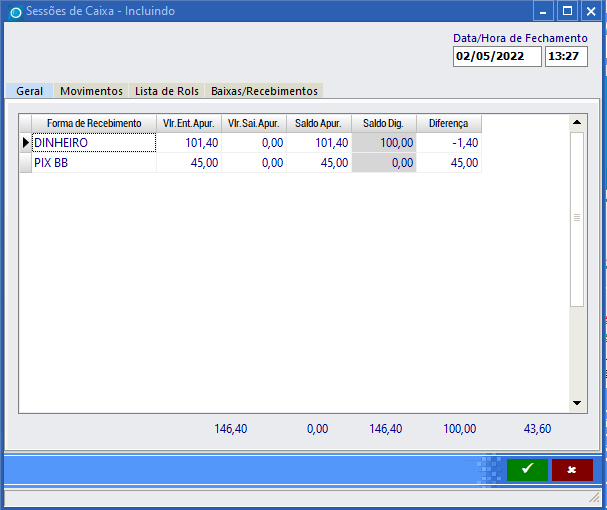 Considera-se uma sessão de caixa o conjunto de movimentações que ocorreram em um período. Ao final desse período, é necessário fazer o fechamento do caixa para conferência dos valores recebidos.