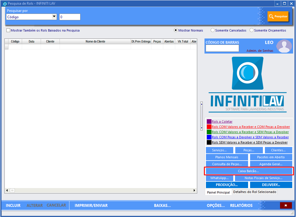 As opções referentes ao Caixa Balcão são encontradas na tela de Balcão do INFINITI LAV, através do botão Caixa Balcão. O sistema apresentará a tela de Pesquisa de Sessões de Caixa.