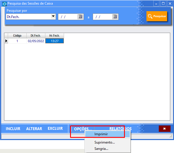 É possível imprimir a sessão de caixa através do botão Opções, selecionando Imprimir.