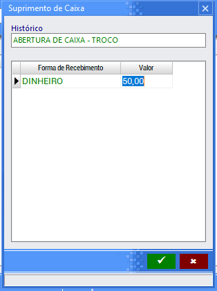 Basta digitar o histórico do Suprimento, informar o valor e clicar no botão verde de confirmação.