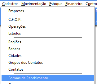No Menu Cadastro encontra-se a opção Formas de Recebimento.