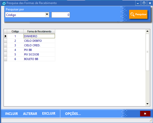 Ao clicar no botão Pesquisar, o sistema apresenta todas as Formas de Recebimento cadastradas.