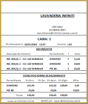 Na impressão serão mostradas todas as informações referentes à sessão de caixa.