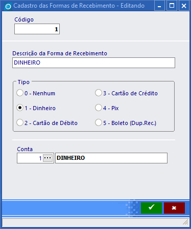 Além da descrição da Forma de Recebimento, é importante selecionar o tipo correto.