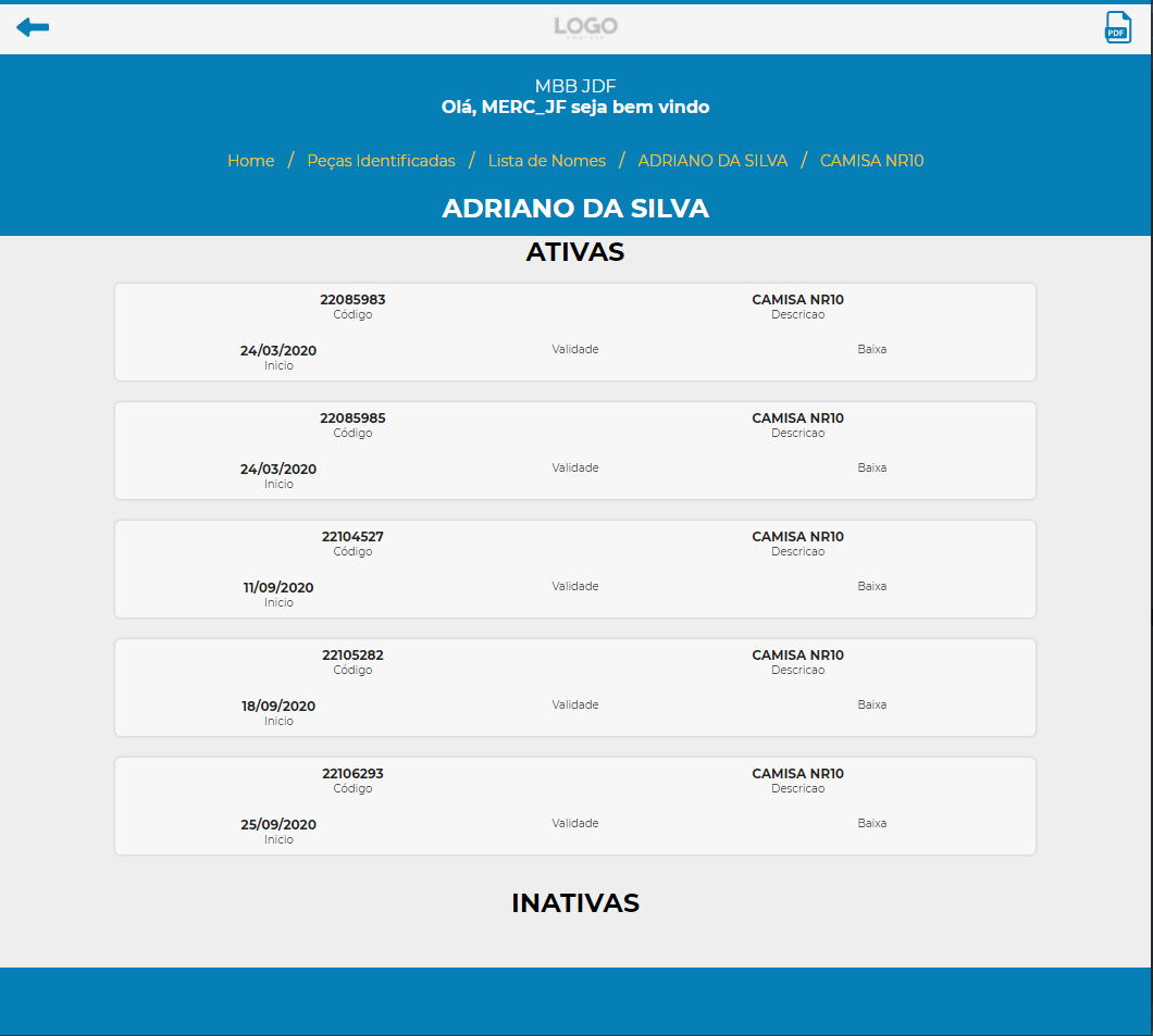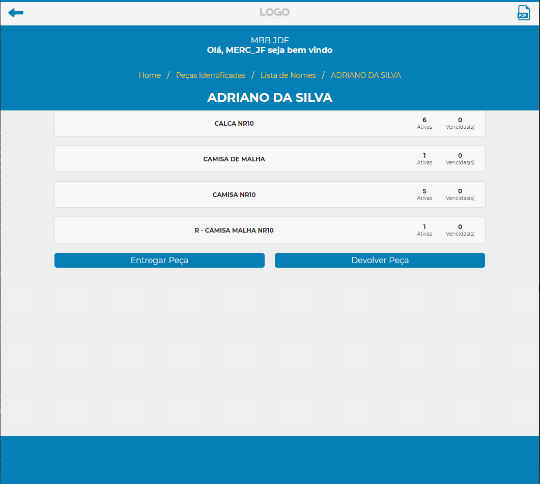Além disso, mostra também a quantidade de peças cadastradas para cada Nome e o número de peças vencidas, quando for o caso de uniformes e que tenham prazo de validade definido.