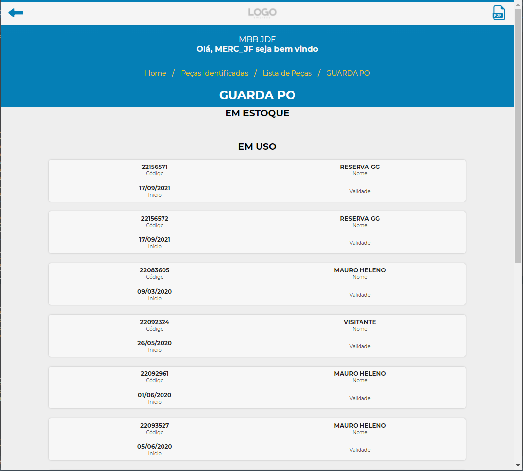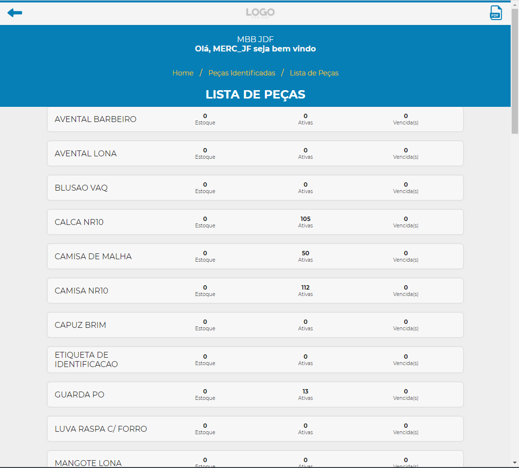 Podemos visualizar a quantidade de peças em Estoque, Ativas e Vencidas.